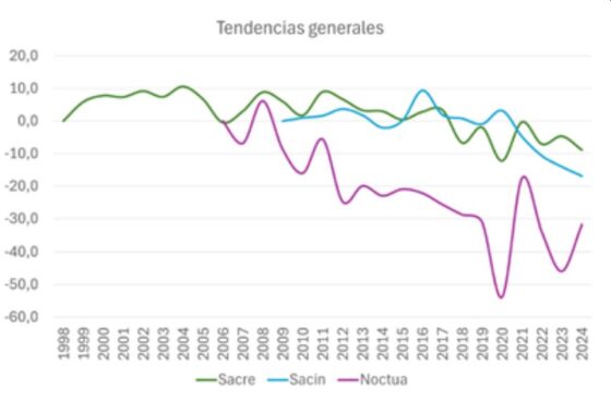 Tendencia de las poblaciones de aves entre 1998 y 2024 para los programas de seguimiento (Sacre, Sacin, Noctua). Fuente: Informe SEO/BirdLife 2024