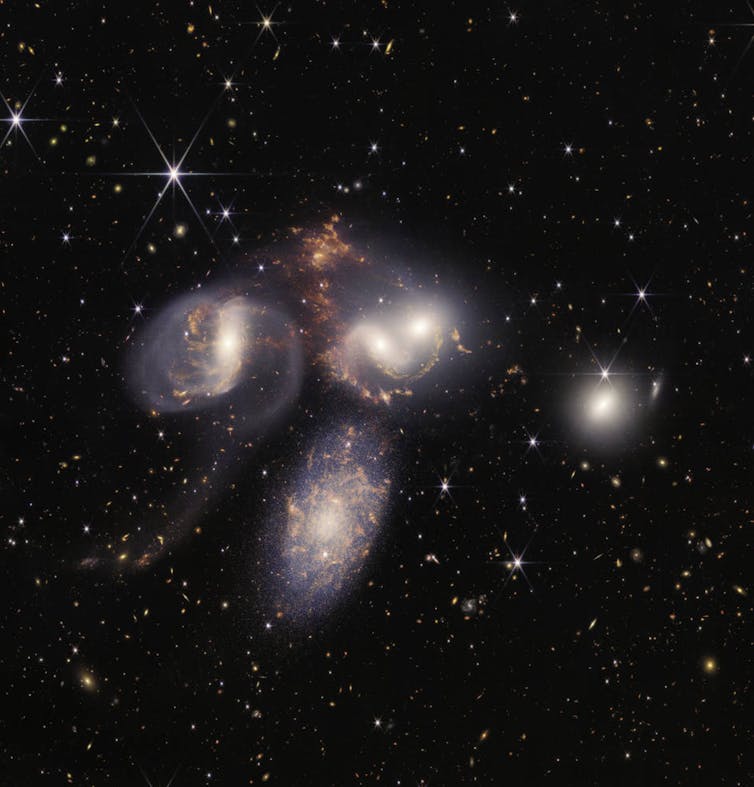 El Quinteto de Stephan es un conjunto de galaxias que están interactuando, posiblemente uno de los espectáculos más dramáticos de universo: una danza cosmológica que sigue la música de la gravedad, un lento vals que sigue sorprendiendo por la multiplicidad de los detalles que el telescopio James Webb está revelando. Además, el instrumento MIRI permite observar las proximidades de un agujero negro, el gas que podría ser devorado por él: Saturno devorando a sus hijos a escala extragaláctica.