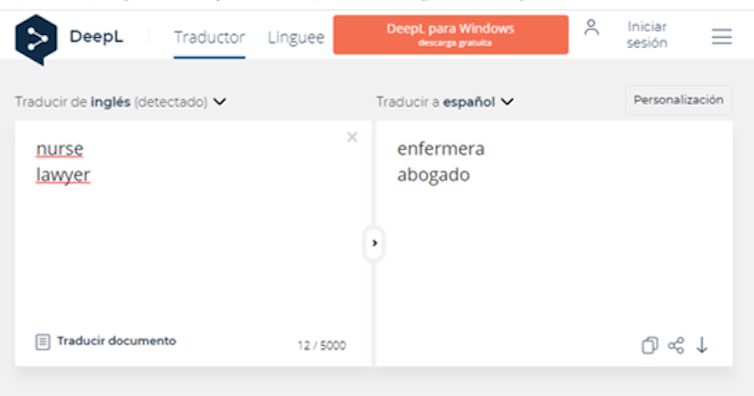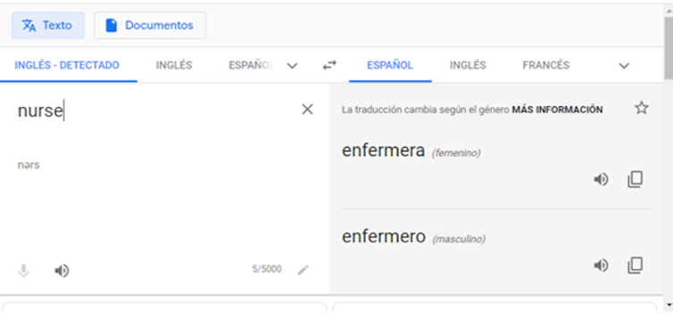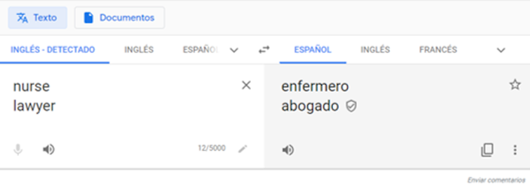 La investigación al respecto ha encontrado sesgos de género al traducir del inglés a idiomas con género gramatical como el nuestro. Por ejemplo, un estudio mostró que al traducir la palabra lawyer del inglés al español había una asociación automática más fuerte con la palabra abogado que abogada. Por el contrario, la palabra nurse estaba más relacionada con la palabra enfermera que enfermero. En principio tendría que haber asociado ambas traducciones con idéntica probabilidad.