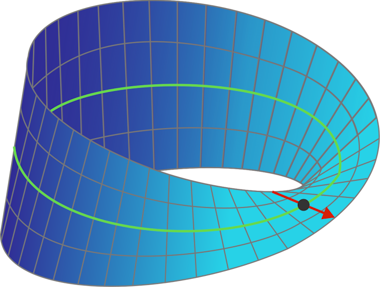 Torsión en el universoOtra posibilidad es salirnos de la teoría de Einstein y permitir la existencia de torsión en el Cosmos. Para entender qué pasa en un universo con esa propiedad podemos imaginarlo como si fuera un cinturón, así que tendría tan solo dos dimensiones. Si nos lo atamos mal alrededor de la cintura de manera que vemos el anverso y el reverso, entonces ese es un universo con torsión. Y si una hormiga se pasease por el cinturón, no podría avisarnos de que nos lo hemos atado mal. Solo si lo miras desde fuera tienes acceso a la tercera dimensión espacial y ves que el cinturón (o universo) está girado.