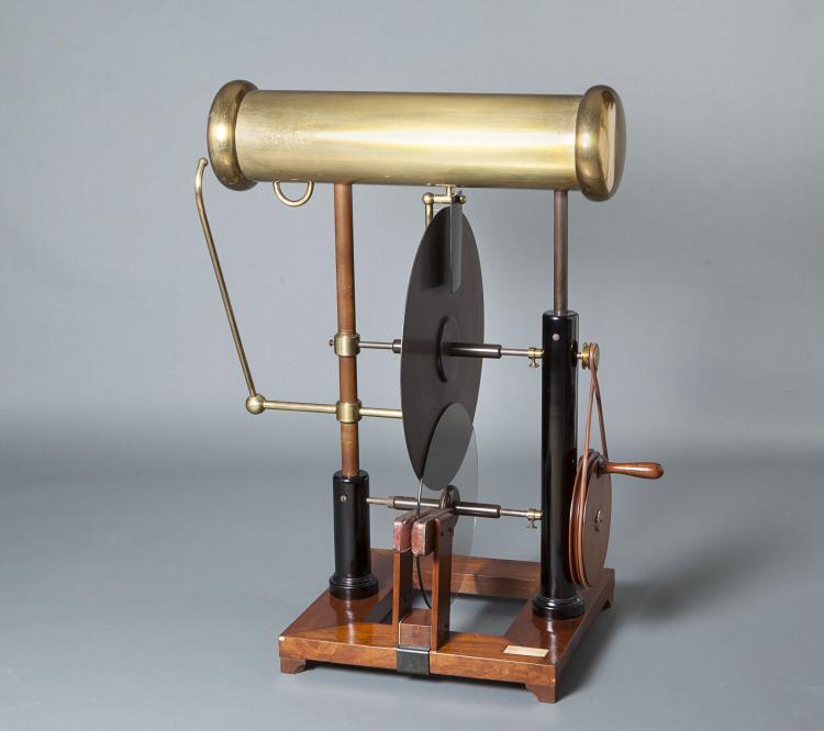 Carré’s Machine generates static electricity using friction and induction. This type of machine was created in 1868 by the French engineer Ferdinand Philippe Carré (1824-1900), and was mainly used for medical applications during the second half of the 19th century. Our piece, from the 19th century, was already part of the physics laboratory of the Royal Seminary of Bergara at the end of said period.