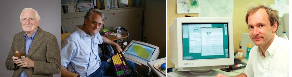 De izquierda a derecha, Douglas Engelbart, Fuente: CC BY-SA 3.0/SRI International; Ted Nelson, Fuente: CC BY-SA 4.0/Belinda Barnet; y Tim Berners-Lee, Fuente: CERN