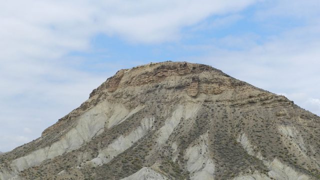 3. irudia: Tabernas basamortuko muino baten itxura. Ikus daiteke kareharriak (laranja kolorekoak, eta elkarren arteko geruza paraleloetan jarriak) eta tuparriak (gris kolorekoak) tartekatzen direla. (Argazkia: Rabealga, CC BY-SA 3.0 / Wikimedia Commons)