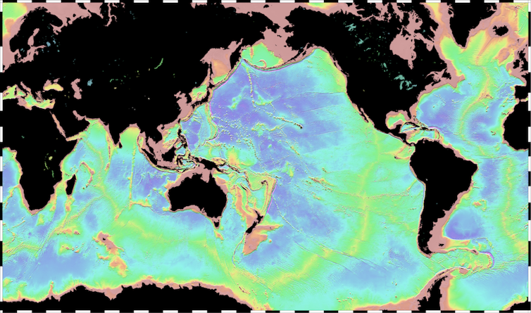 Batimetría general de los océanos. La imagen está generada usando datos globales de baja resolución. Las zonas más profundas, en tonos azulados, se sitúan entre las dorsales medio-oceánicas (tonos amarillo-verdosos) y los márgenes continentales (tonos anaranjados).