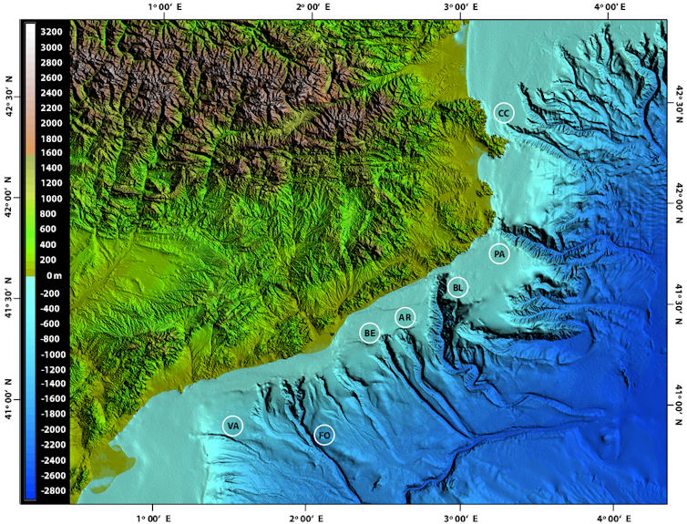 Relieve en color del margen continental catalán y del continente adyacente, generado a partir de datos de alta resolución. Destaca el tamaño de los valles submarinos en relación con los valles fluviales. De sur a norte, los principales cañones de la zona son el de Valldepins (VA), del Foix (FO), del Besòs (BE), de Arenys (AR), de Blanes (BL), de Palamós (PA) y del Cap de Creus (CC).
