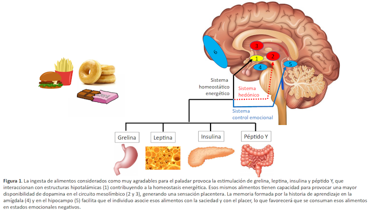 Como se observa en la Figura 1, la comida, y de forma más clara la comida rica en hidratos de carbono o grasas agradables al paladar (como los que aparecen en el lado izquierdo de la figura), interaccionan con el organismo a través de tres sistemas.
