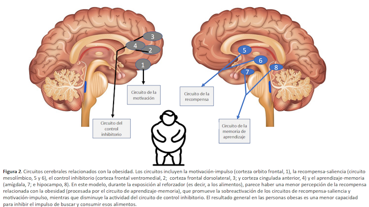 Los estudios de imágenes cerebrales indican que los circuitos alterados en personas con obesidad son los mismos que se encuentran alterados en personas con adicción a drogas de abuso y pone en evidencia un desequilibrio entre los que motivan las conductas (por su implicación en la recompensa y el condicionamiento) y los que controlan e inhiben las respuestas de alimentación.