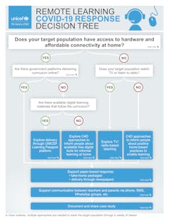 La variedad de contextos es tan amplia –tener o no electricidad, radio, TV, teléfono móvil, conexión de internet u ordenador– que UNICEF ha desarrollado un árbol de decisión sobre enseñanza remota, una herramienta rápida para determinar los canales más apropiados para la distribución de contenidos educativos.